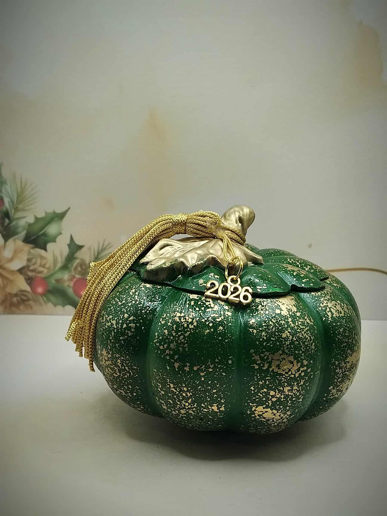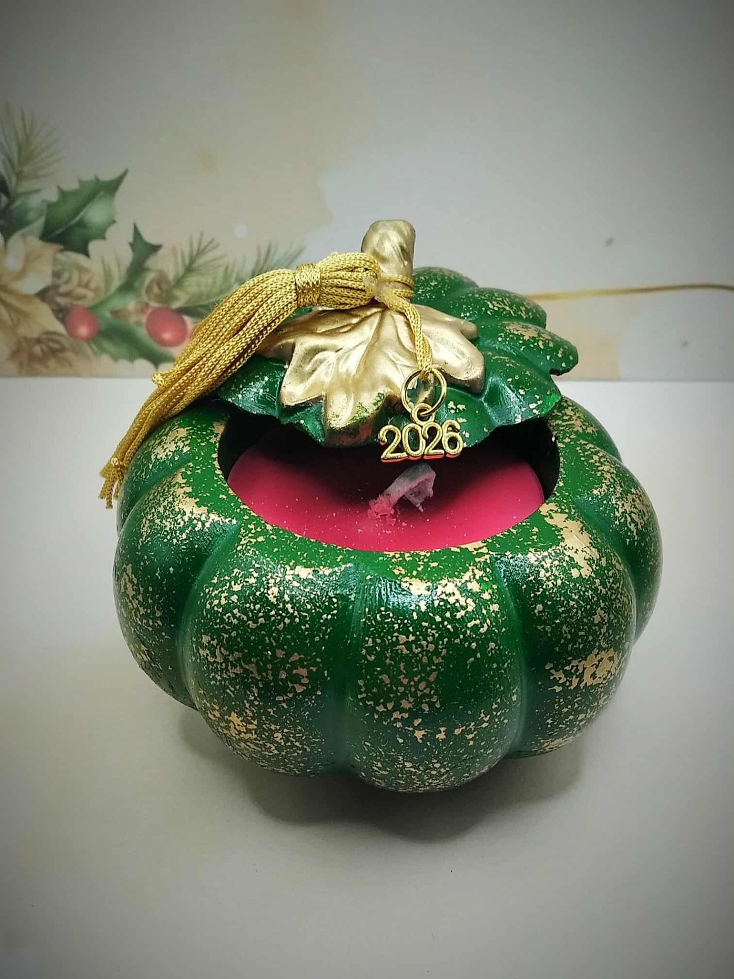 Χειροποίητο γούρι κολοκύθα απο γύψο σε πράσινο χρυσό με αρωματικό κερί