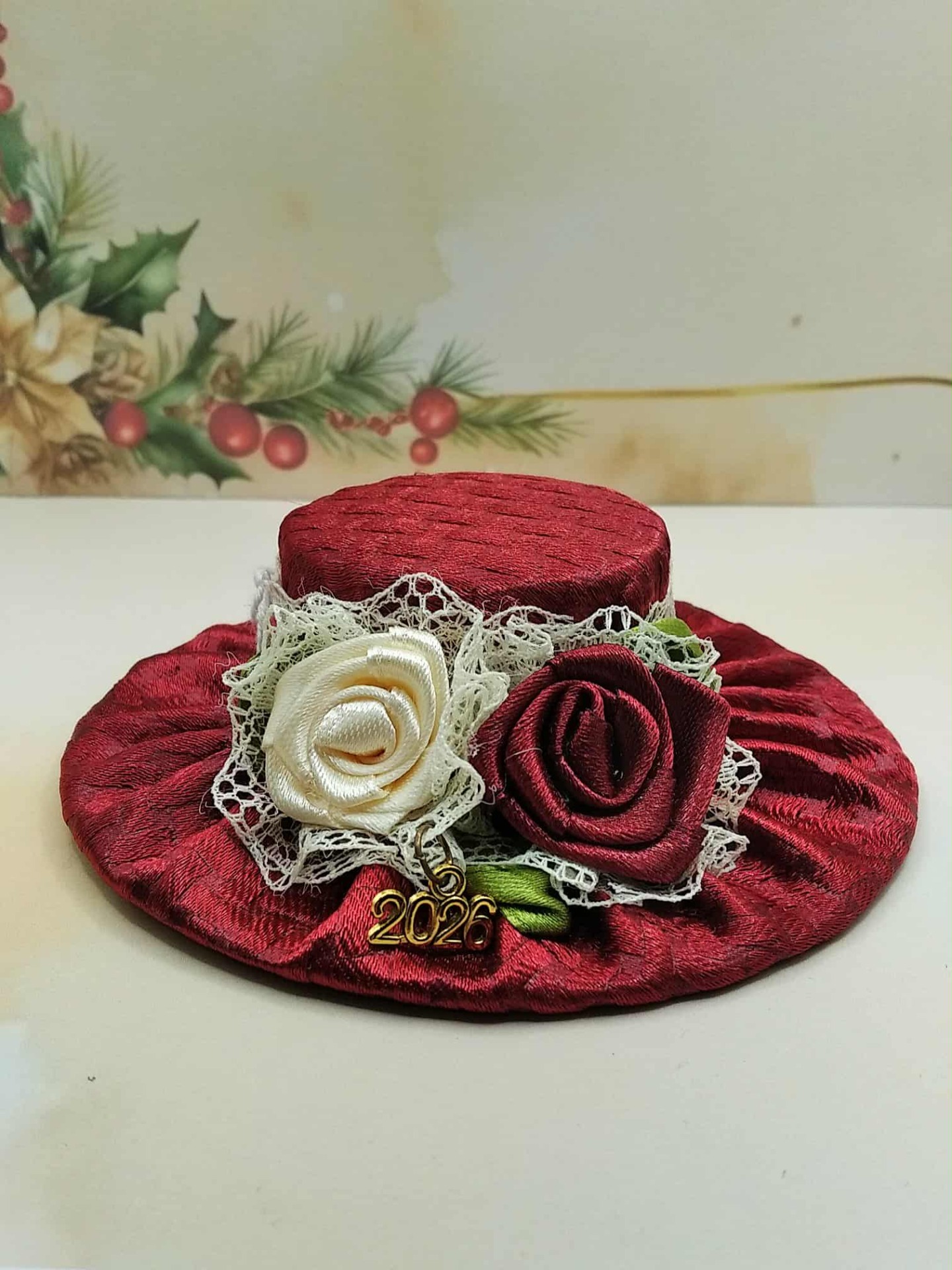Χειροποίητο γούρι καπέλο σε μπορντώ τόνους με σατεν χειροποίτα τριανταφυλλάκια.