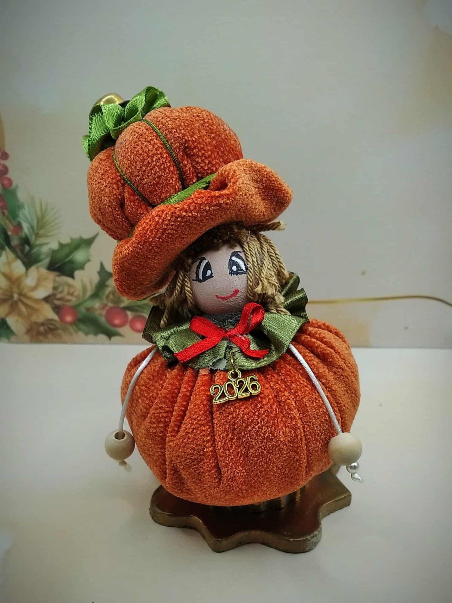 Χειροποίητη "κυρία κολοκύθα" σε  χρώμα πορτοκάλι  ραμμένη στο χέρι, με πήλινη χειροποίητη βάση.