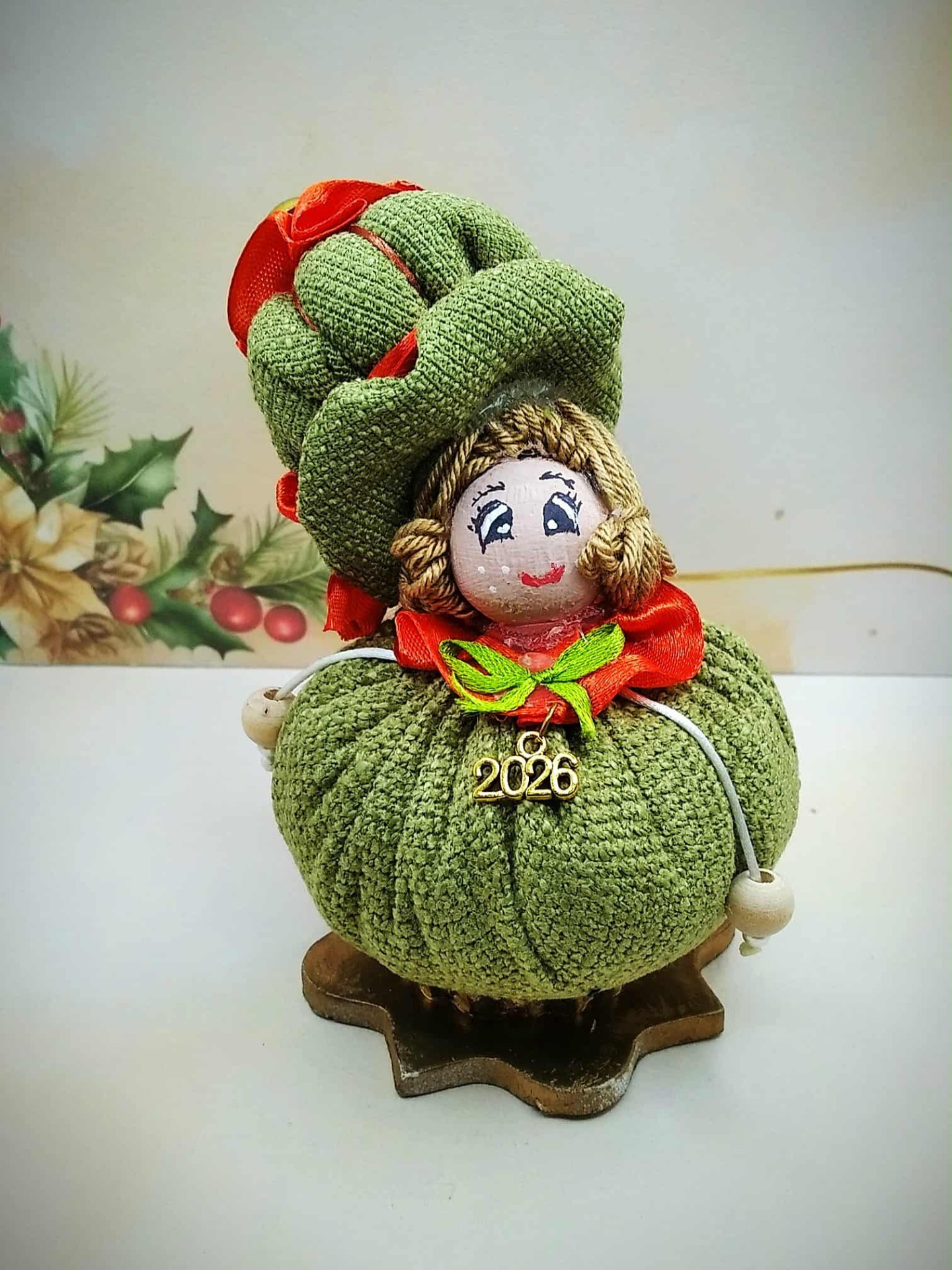 Χειροποίητη "κυρία κολοκύθα" σε  χρώμα πράσινο ραμμένη στο χέρι, με πήλινη χειροποίητη βάση.