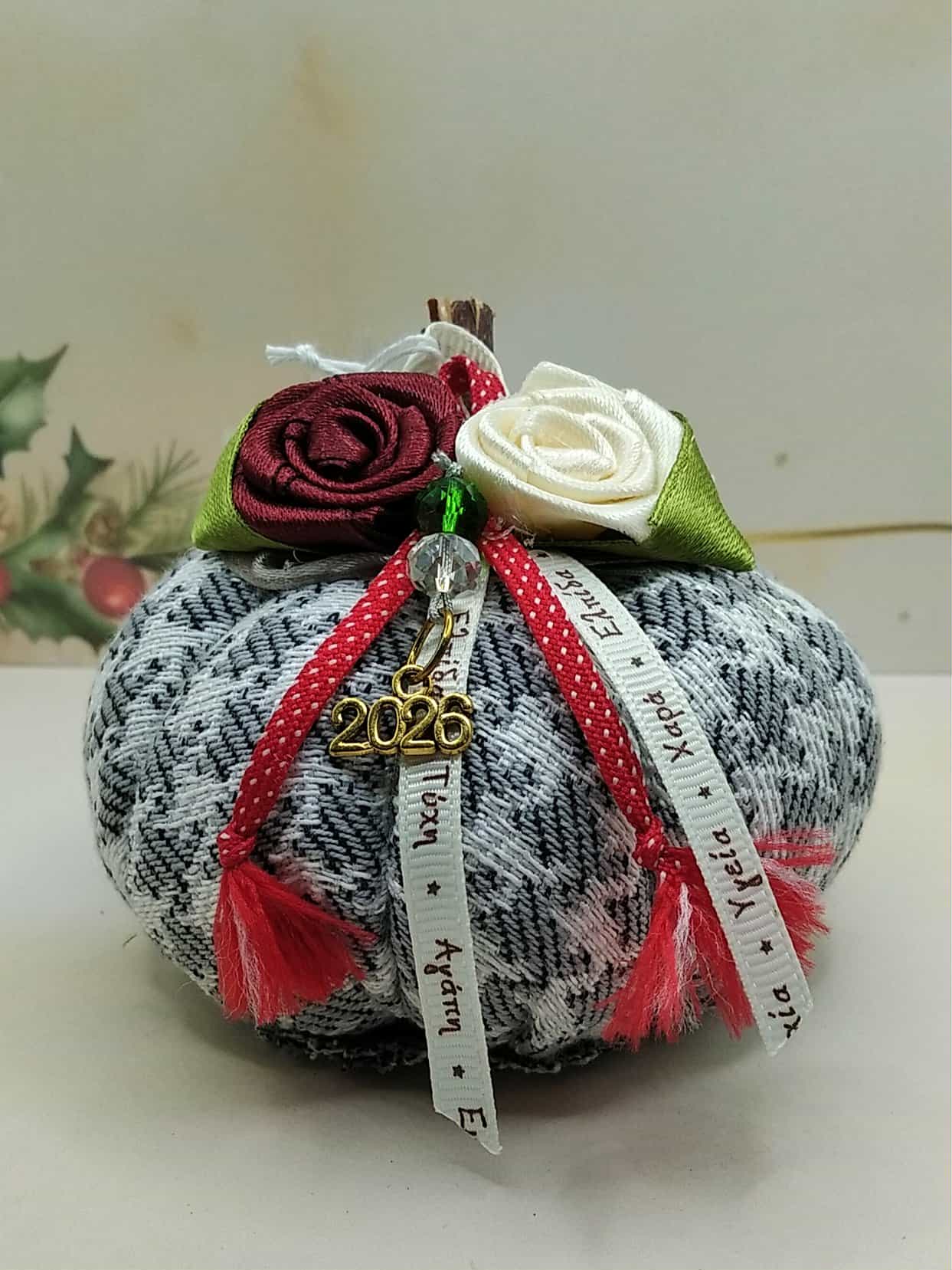 Χειροποίητο γούρι κολοκύθα σε γκρι  με λευκό