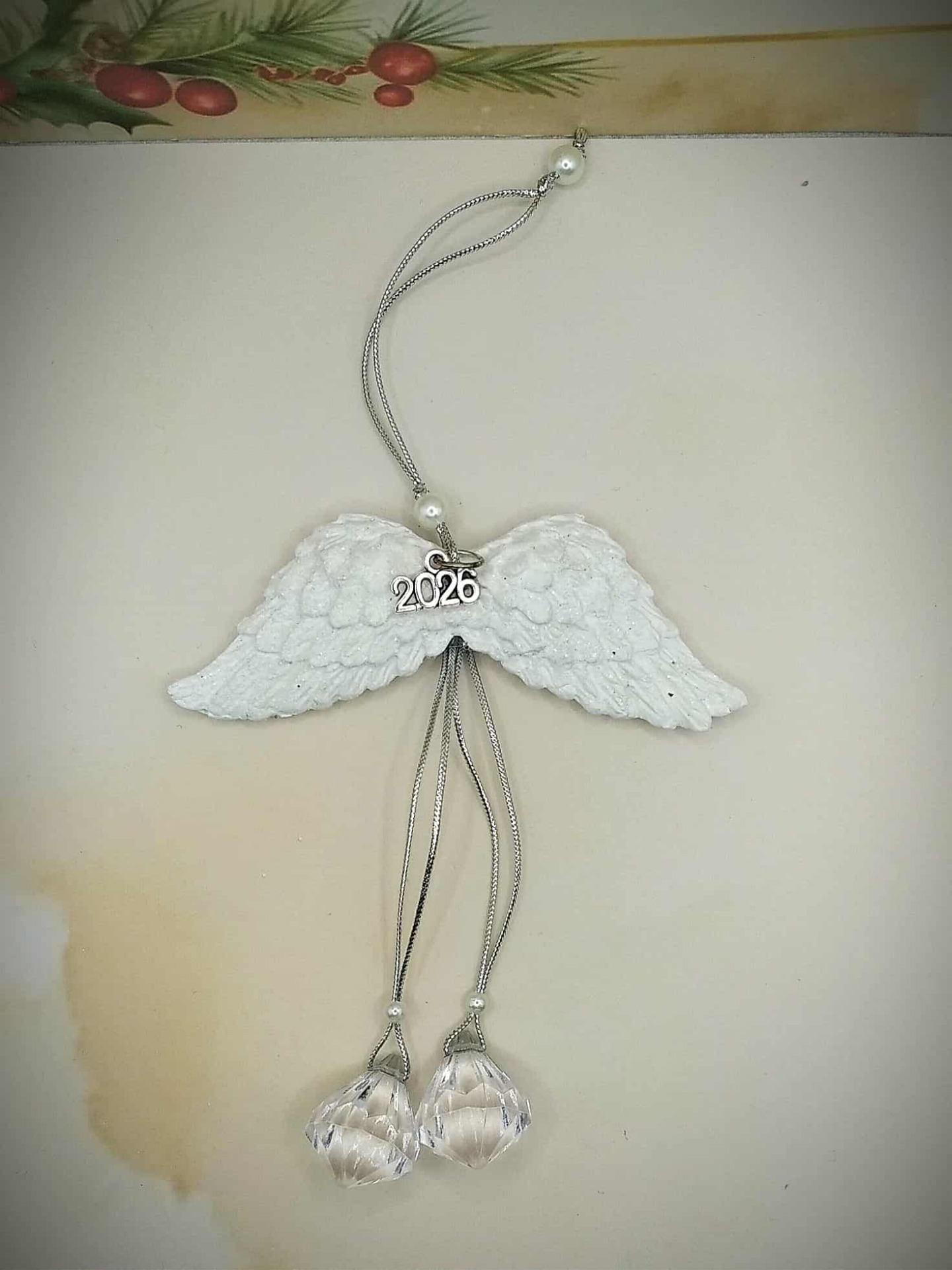 Γούρι φτερά άγγελου με χάντρες λευκό με γκλίτερ