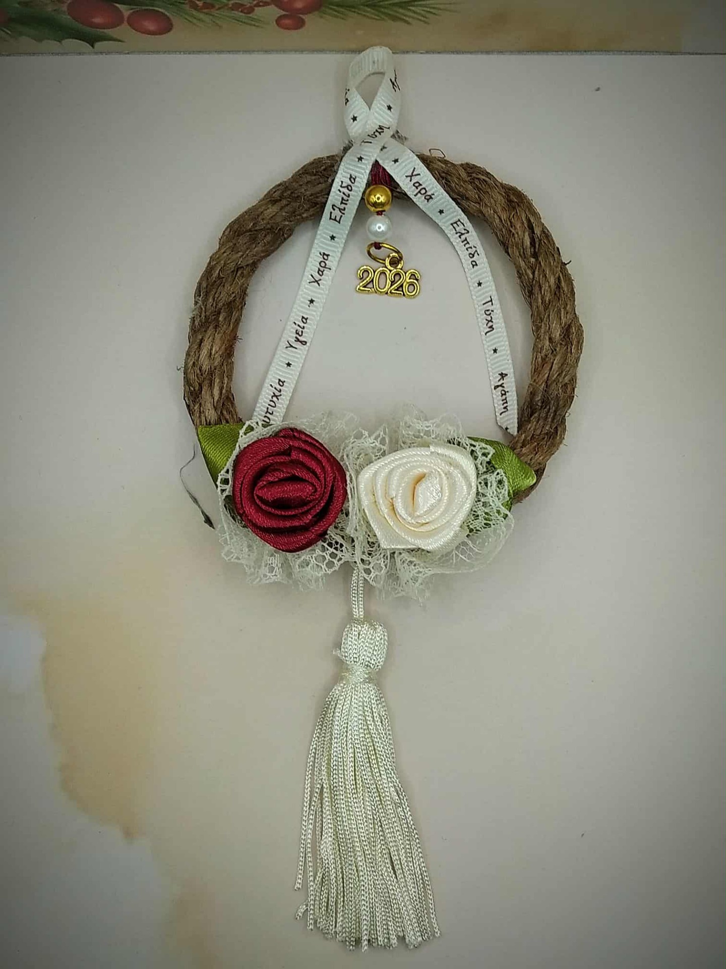 Χειροποίητο κρεμαστό γούρι με σχοινί και λουλούδι
