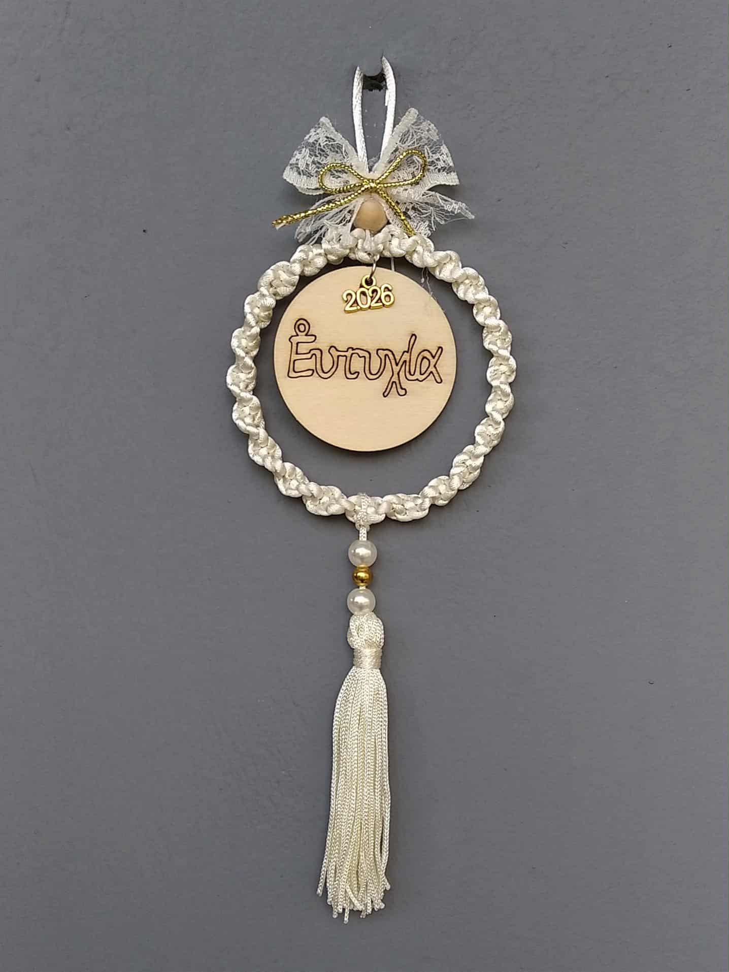 Χειροποίητο κρεμαστό γούρι με σχοινί και ξύλινη ροζέτα με ευχή