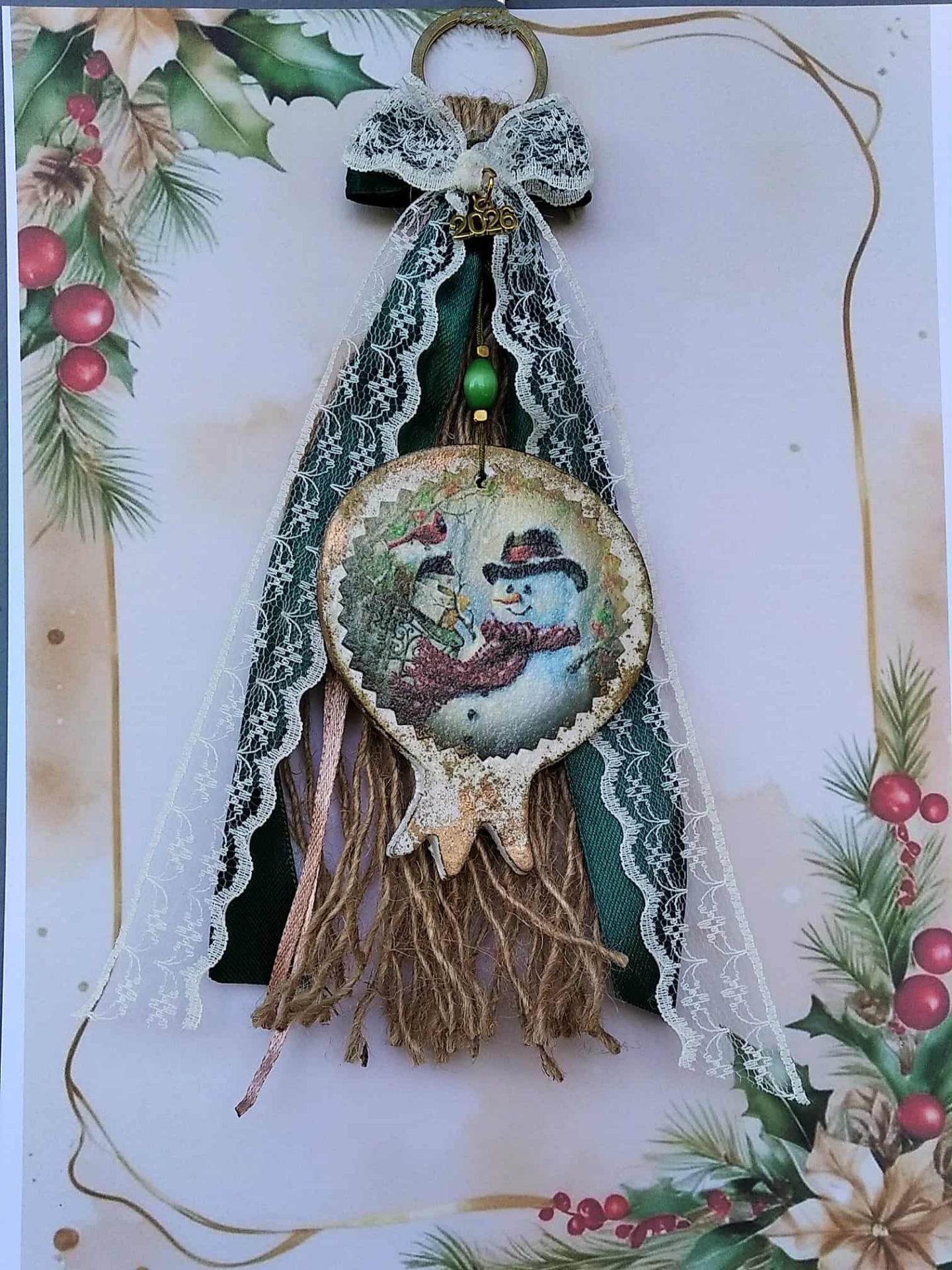 Χειροποίητο κρεμαστό ρόδι με σχοινί και κορδέλες με vintage εικόνα.