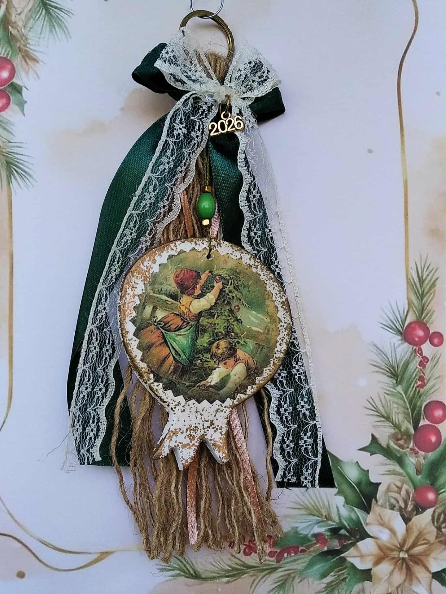 Χειροποίητο κρεμαστό ρόδι με σχοινί και κορδέλες με vintage εικόνα.