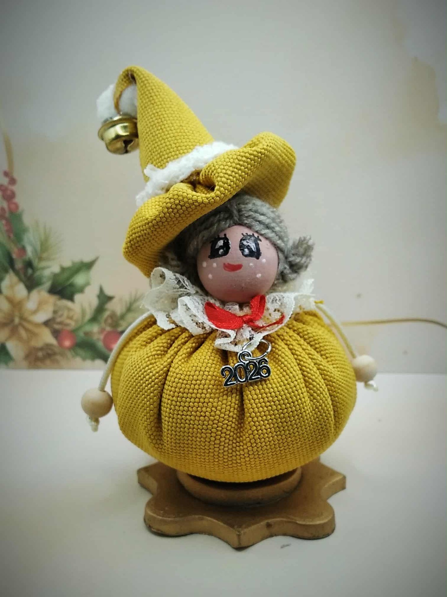 Χειροποίητη "κυρία κολοκύθα" σε κροκί χρώμα, ραμμένη στο χέρι, με πήλινη χειροποίητη βάση.